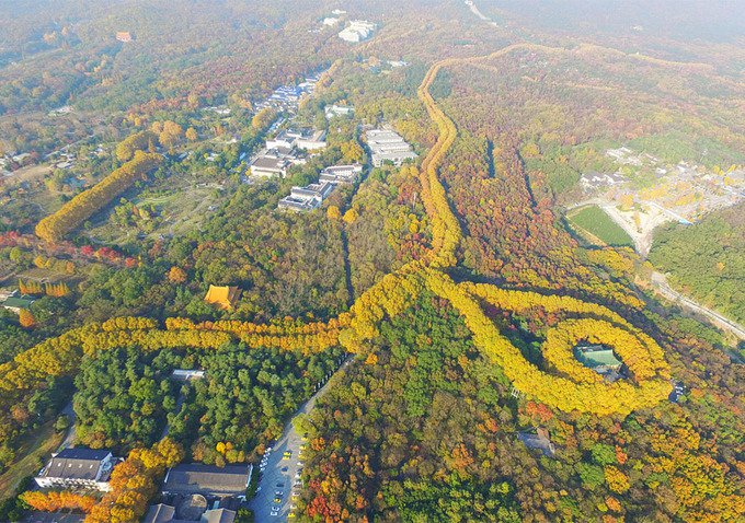 Những hàng cây ngô đồng này được trồng tạo thành hình dáng một chiếc vòng cổ khổng lồ và vị trí trung tâm chính là dinh thự của vợ chồng Tưởng Giới Thạch - Tống Mỹ Linh cung. Vào mùa thu, khi lá của những cây ngô đồng cổ thụ chuyển sang màu vàng rực rỡ càng làm tôn lên tòa cung điện nguy nga ở chính giữa.